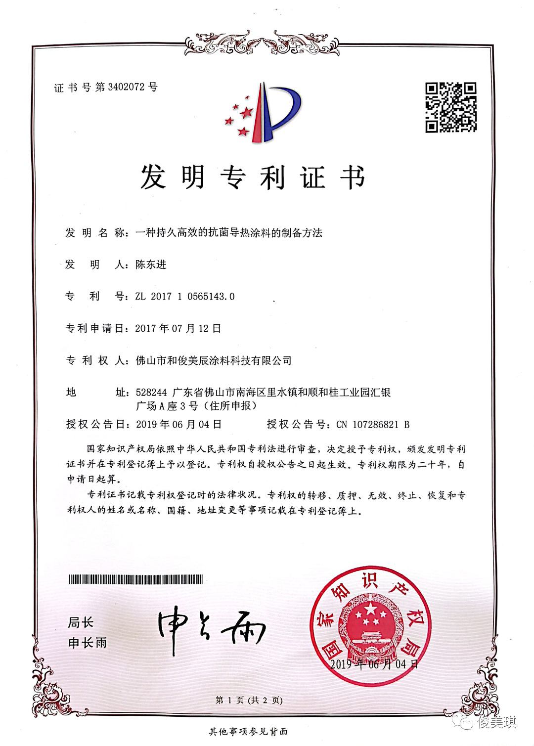 發(fā)明專利證書